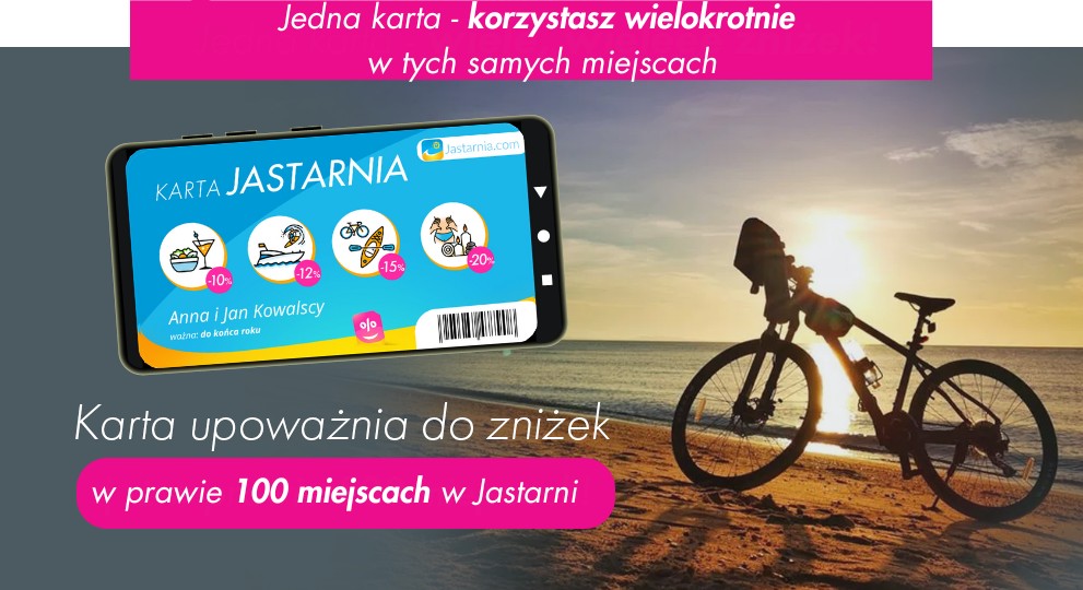 Z Kartą JASTARNIA, każda wizyta w Twoich ulubionych miejscach staje się jeszcze bardziej satysfakcjonująca. Wykorzystuj swoje zniżki do woli i ciesz się ulubionymi atrakcjami, restauracjami oraz noclegami w Jastarni, nie tylko raz, ale wielokrotnie do końca roku.